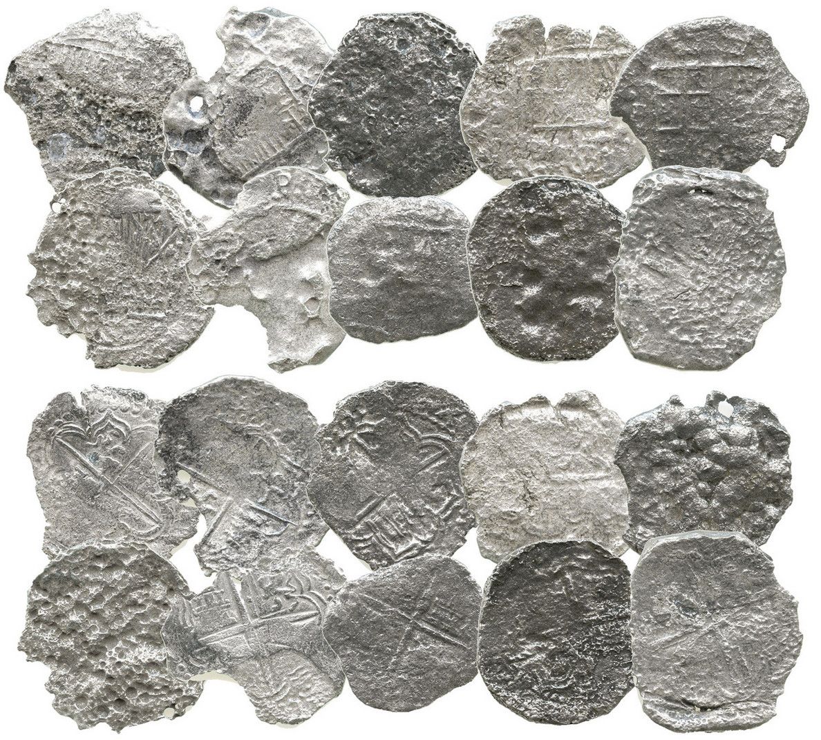 Lot of 10 Potosi, Bolivia, cob 8 reales, Philip III, assayers not visible, Grade 4 (some Grade-3 quality. 141.4 grams total. Mostly moderately to heavily corroded but with identifiable shields and crosses. With Fisher certificates #168684, 168702, 168720, 171232, 222671, 222685, 222713, 222723, 222745 and 222747. Recovered from: Atocha, sunk in 1622 west of Key West, Florida
