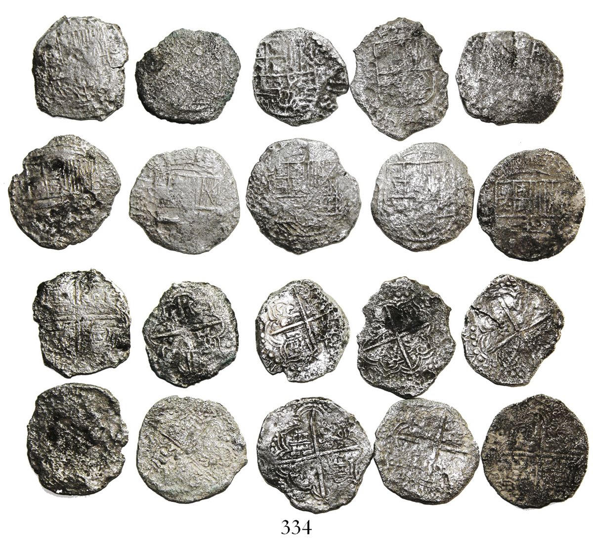 Lot of 10 Potosi, Bolivia, cob 8 reales, Philip III, assayers not visible, all Grade 3. KM-10. 188.91 grams total. Moderate corrosion but generally clear shields and crosses. With Fisher certificates #131408, 134180, 141704, 147423, 147725, 147745, 147765, 147785, 147826 and 148053. Recovered from: Atocha, sunk in 1622 west of Key West, Florida