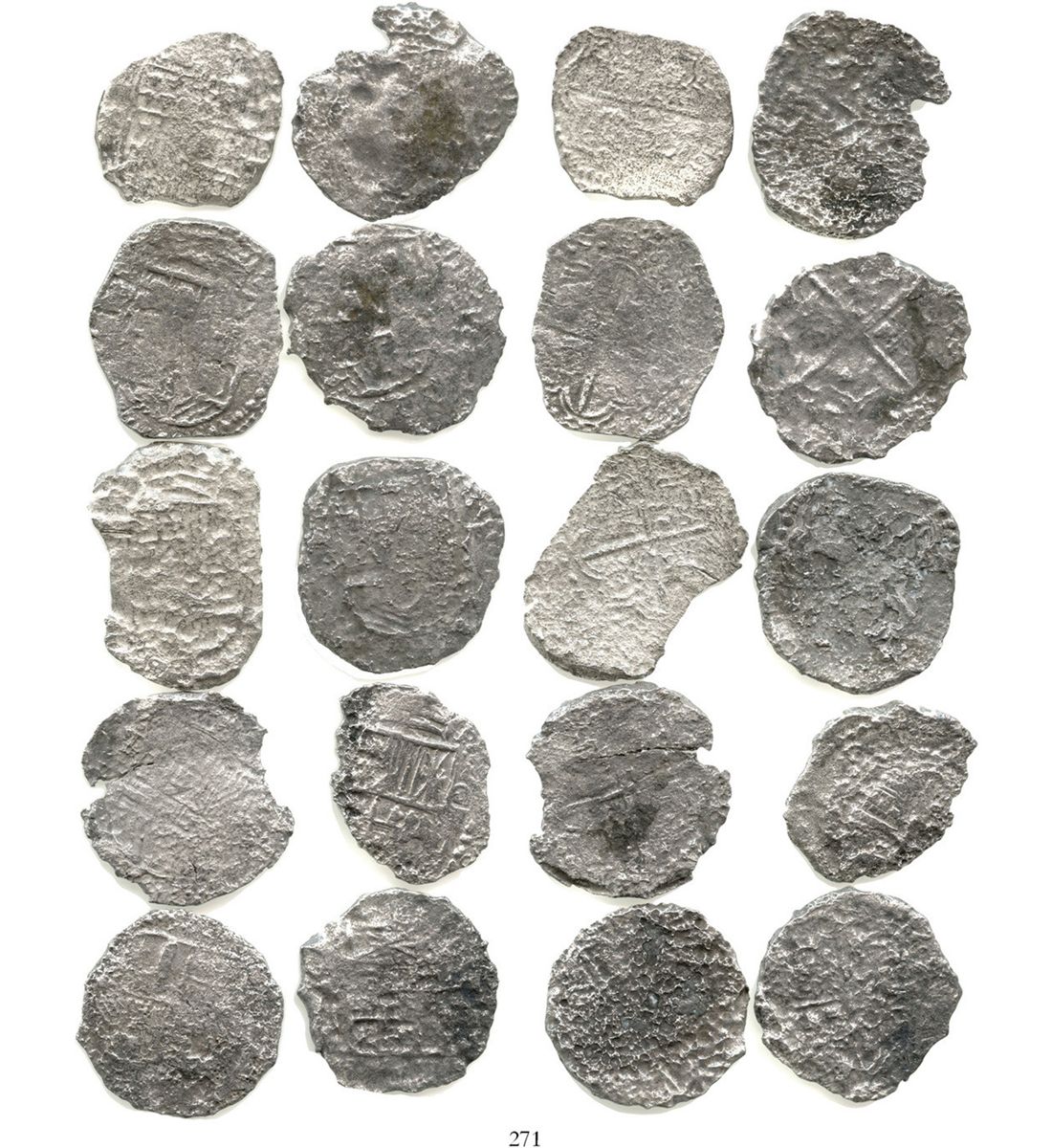 Lot of 10 Potosi, Bolivia, cob 8 reales, Philip III, various assayers (where visible), Grade 4 but some are Grade-3 quality KM-10. 176.8 grams total. Moderate to heavy corrosion but with generally decent shields and/or crosses. With Fisher certificates #166950, 166974, 167010, 167022, 167046, 167058, 167070, 167094, 167118 and 167130. From the Atocha, sunk in 1622 west of Key West, Florida