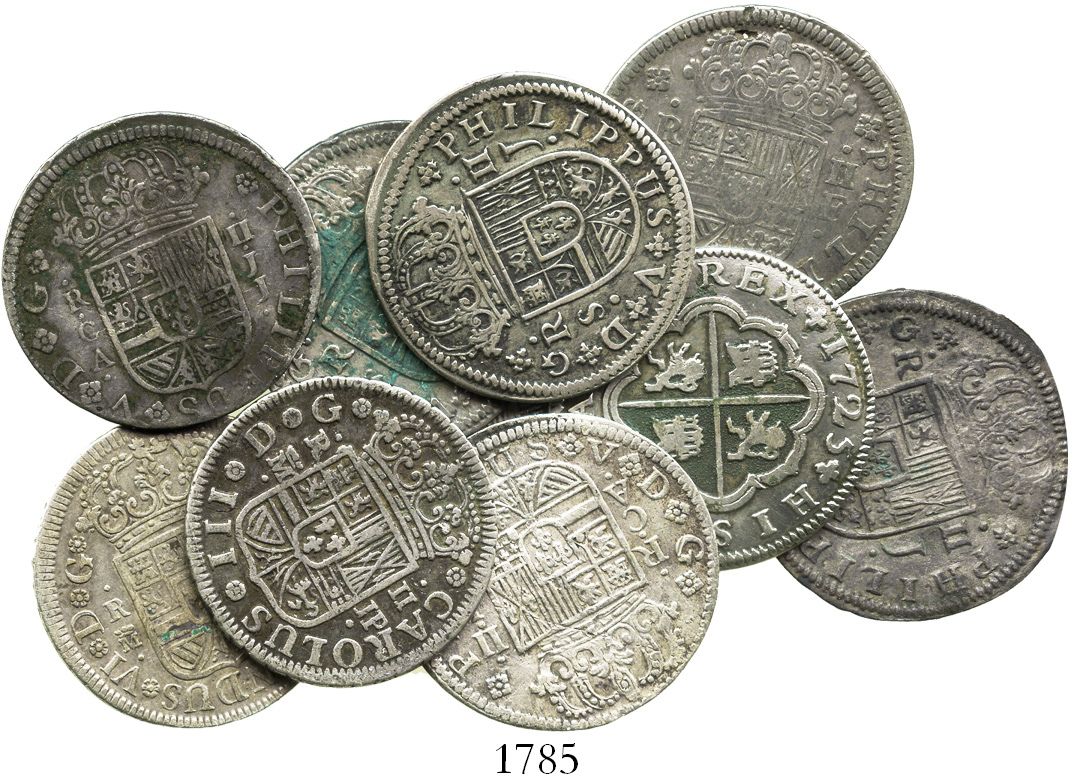 Lot of 10 Spanish milled 2R "pistareens" of Philip V, Ferdinand VI and Charles III, various mints and dates (1721-1760). 54.7 grams total. AVF on average, with decent crosses, some toned, some with green spots but no big problems.