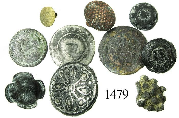 Lot of 10 small bronze/pewter buttons. 38.6 grams, about ½" to 1" each. Mostly ornate in design, some with lettering, colors ranging from bright copper to black, light encrustation in crevices, about half with intact loops on back. Recovered from: Unidentified English or French wreck sunk in the late 1700s in the English Channel.