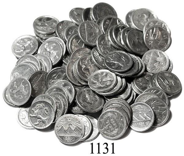 Lot of 100 "lion"-type ¼ reales, 1861-1893. KM-130 through 159. Mixed grades of VF to AU, all with the popular lion design on one side that jewelers love for rings and earrings but also necessary for date collectors.