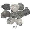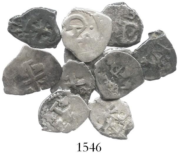 Lot of 11 Potosi, Bolivia, cob 1/2R, various periods (Philip IV, Charles II, Philip V, Louis I, Ferdinand VI), dates not visible. 0.6 to 1.5 grams each. Good mix of periods with decent crosses and monograms but not dates, F-VF on average, none salvaged or holed but most with toning.