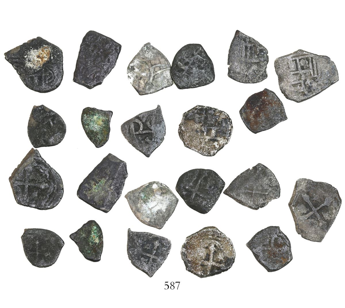 Lot of 11 encrusted Mexican cob 1R (6) and 1/2R (5), uncleaned (as found). 20.09 grams total. Mostly solid, some with green and/or white encrustation, most with coin details visible, perfect for cleaning yourself to try to find a diamond in the rough! Pedigreed to the collection of John Keshishian (Kip Wagner's doctor). Recovered from: Spanish 1715 Fleet, east coast of Florida