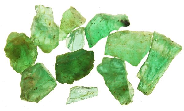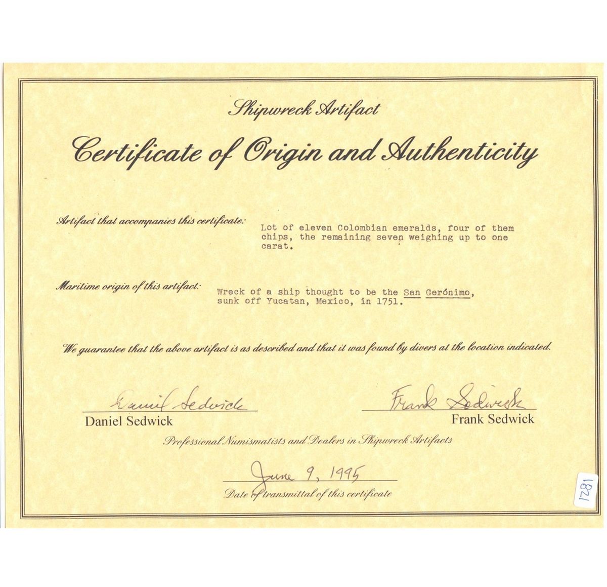 Lot of 11 small natural emeralds up to 1 carat each. Approx. 3mm to 8mm each. Mostly pale green but somewhat translucent stones, some with light surface encrustation, scarce provenance. (Note: image enlarged for details.) With Frank and Daniel Sedwick certificate (1) from 1995. Recovered from: San Geronimo, sunk in 1751 off the Yucatan peninsula of Mexico