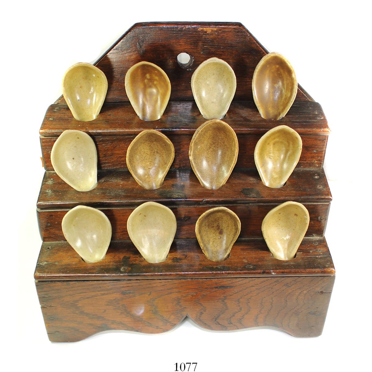Lot of 12 Chinese porcelain spoons in a wooden display rack. 1.54 kg total, about 10-1/2" x 6" x 10", each spoon around 4" long. These are plain, unadorned spoons with gray-olive-brown color under glaze, but each one is intact and perfectly suited for its hole in the dark-brown wooden rack, which appears to be an antique as well. With original Nagel (Germany) auction stickers. Recovered from: Tek Sing, sunk in 1822 in the South China Sea