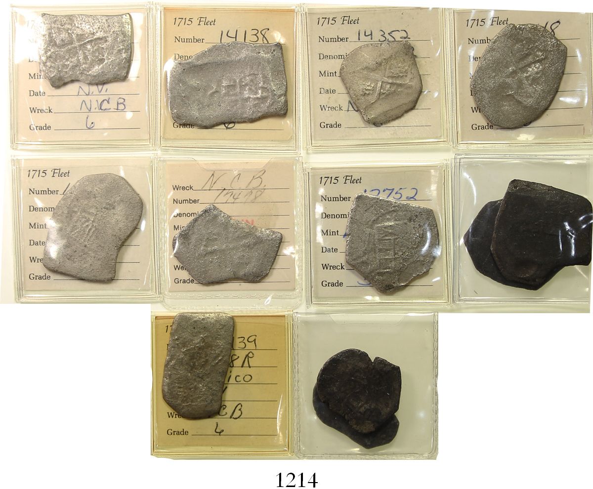 Lot of 12 Mexican silver cobs (nine 8R and three 4R), assayer J or not visible, some uncleaned. 161.43 grams total. Moderate to heavy corrosion but some details clear, 4 dark as uncleaned but the rest slightly silvery. Most with Fisher tags and various certificates from the salvagers. Recovered from: Spanish 1715 Fleet, east coast of Florida
