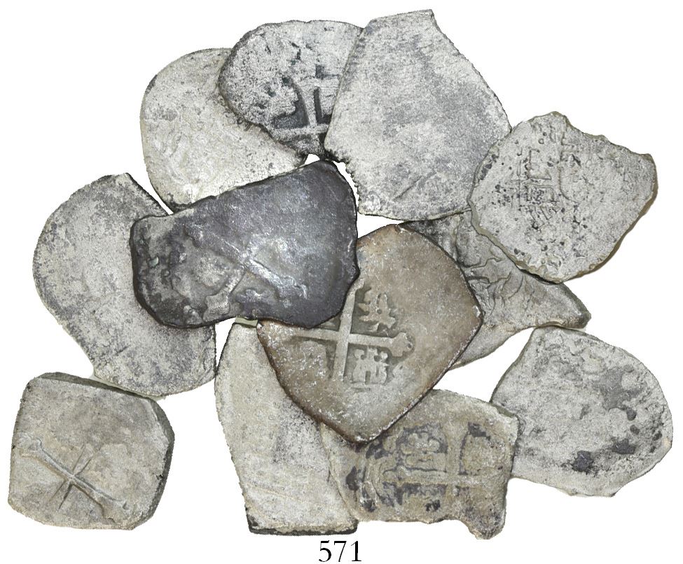 Lot of 12 Mexico City, Mexico, cob 2 reales, Charles II and Philip V, various assayers (where visible). 61.04 grams total. Generally decent crosses and/or shields despite light to moderate corrosion, only one toned. Recovered from: Spanish 1715 Fleet, east coast of Florida