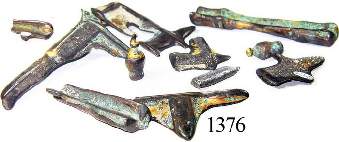 Lot of 12 pieces of a gold-plated pewter(?) box. 199 grams, ¾" to 3" each. Twelve worn fragments of various shapes and sizes with green and white encrustation on top of bright-gold gilding, two of the pieces obviously finials of some sort but the rest probably lateral or corner pieces. Recovered from: Spanish 1715 Fleet, east coast of Florida. With Robert Marx certificate.