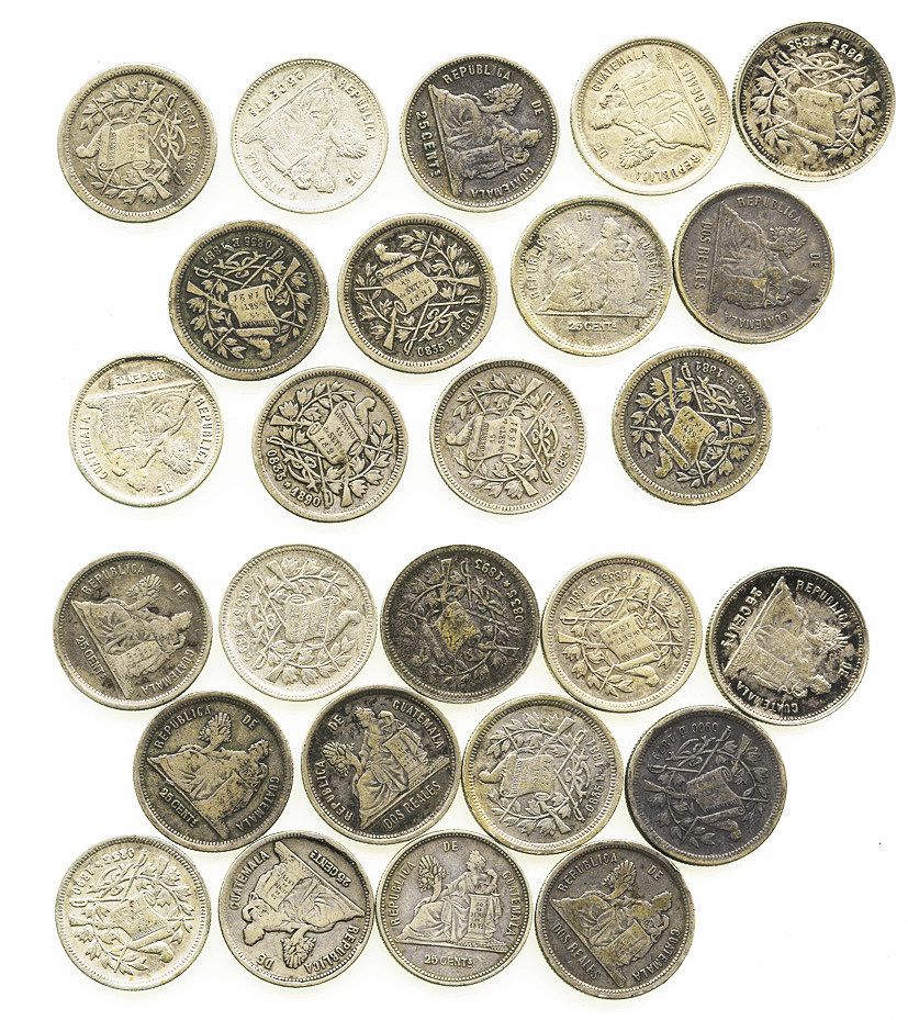 Lot of 13 Guatemala 2R / 25c: 2R 1879D and 1881E (3); 25c 1881E (3), 1889, 1890 (2) and 1893 (3). 78.2 grams total. Mostly VF but some XF or better, mostly lightly toned, a few lustrous.