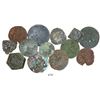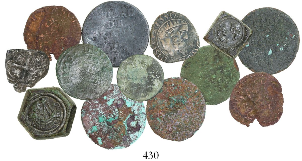 Lot of 13 miscellaneous coins and coin weights, including one Potosi cob 1R 1661E, ten French copper minors and two copper coin weights, late 1400s to mid-1600s. 28.6 grams total. Mostly worn and corroded and dark, but the two weights quite solid and well marked (one with facing busts a la Ferdinand and Isabel and the other with 1400s-style ship), an interesting and diverse group for study. Recovered from: Unidentified 1600s wreck in the English Channel