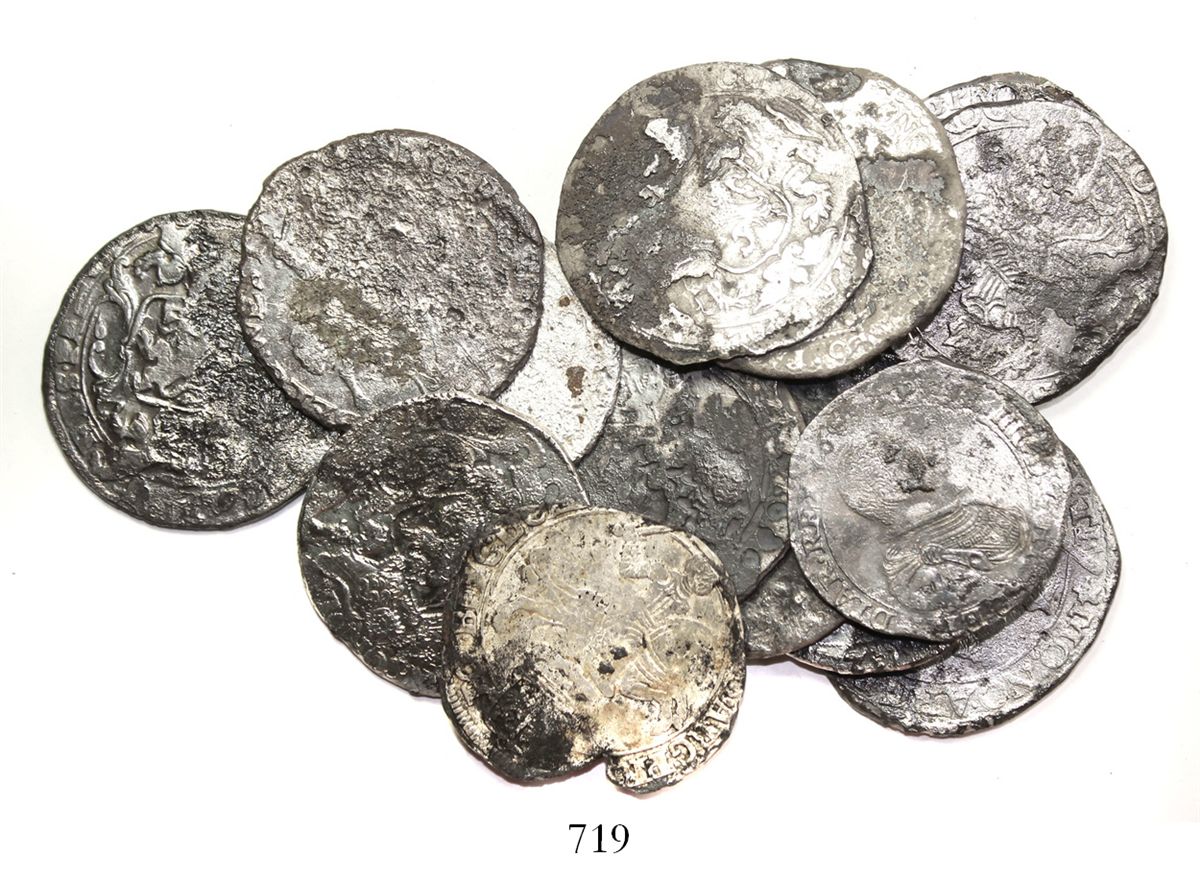 Lot of 14 Dutch silver coins (12 "rider" ducatoons and 2 portrait 1/2 ducatoons), 1600s, very rare from this wreck. 322.13 grams total. All lightly to moderately corroded but with toning and some good details, an interesting departure from the pillar dollars and Guatemala cobs that typify this Dutch shipwreck. Recovered from: Reijgersdaal, sunk in 1747 off South Africa