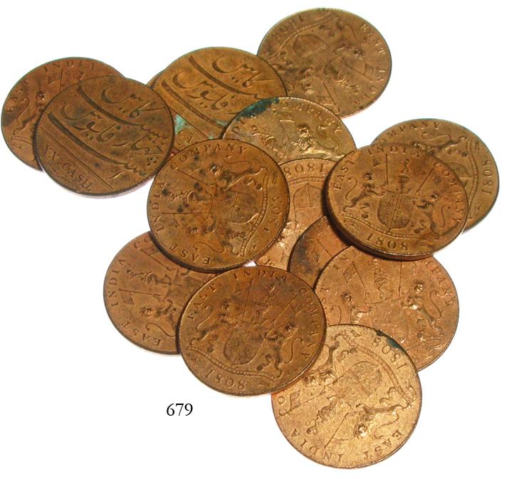 Lot of 15 English East India Co. copper XX cash, 1808, matte surfaces. 137.7 grams total. Choice specimens (no corrosion) in bright copper color (cleaned but not polished), a few with dark stains, popular for retail sales. Recovered from: Admiral Gardner, sunk in 1809 southeast of England