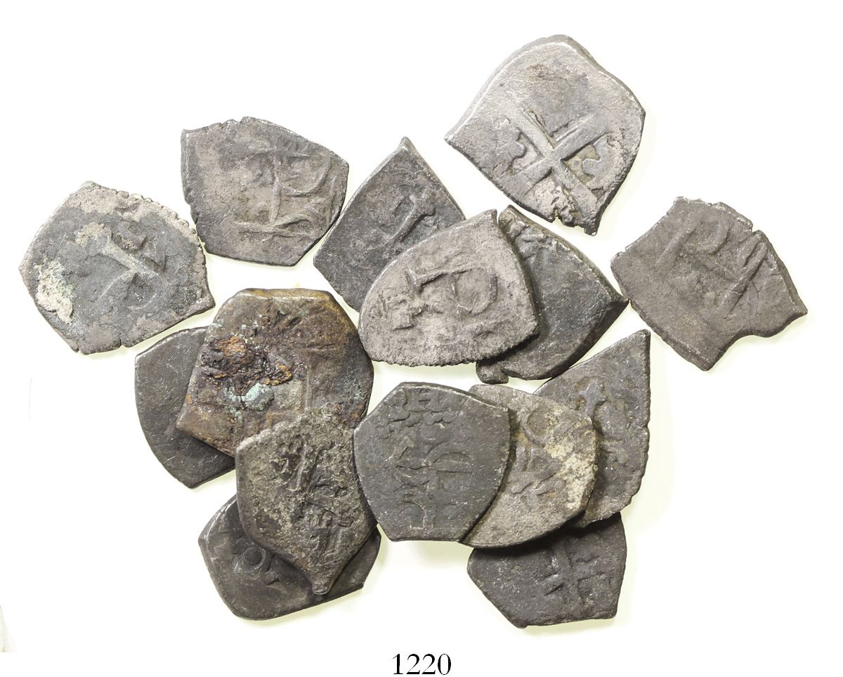 Lot of 15 Mexico City, Mexico, cob 1R (2) and 1/2R (13), Charles II and Philip V. 26.53 grams total. Uncleaned and dark but not overly corroded, one with thick orange encrustation, some with nice details. Recovered from: Spanish 1715 Fleet, east coast of Florida