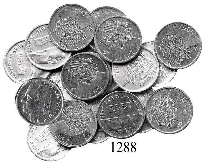 Lot of 19 Spain aluminum pesetas, 1989-1997. KM-832. 0.6 gram each. High-grade date-run of modern coins, all AU-UNC.