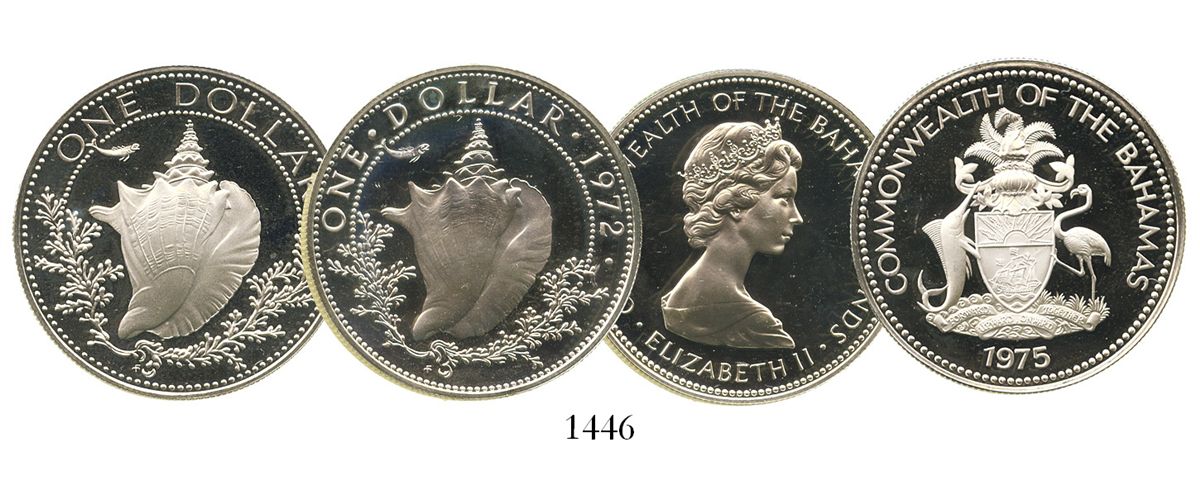 Lot of 2 Bahamian proof "conch" dollars, 1972 and 1975 (copper-nickel). KM-22 and 65. 35.6 grams total. Choice cameo proofs, the 1972 with light fingerprint in field but otherwise flawless.