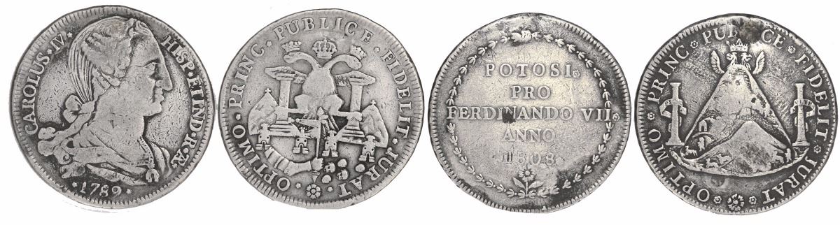 Lot of 2 Bolivian 8R-sized proclamation medals: Chuquisaca (La Plata), 1789, Charles IV; and Potosi,