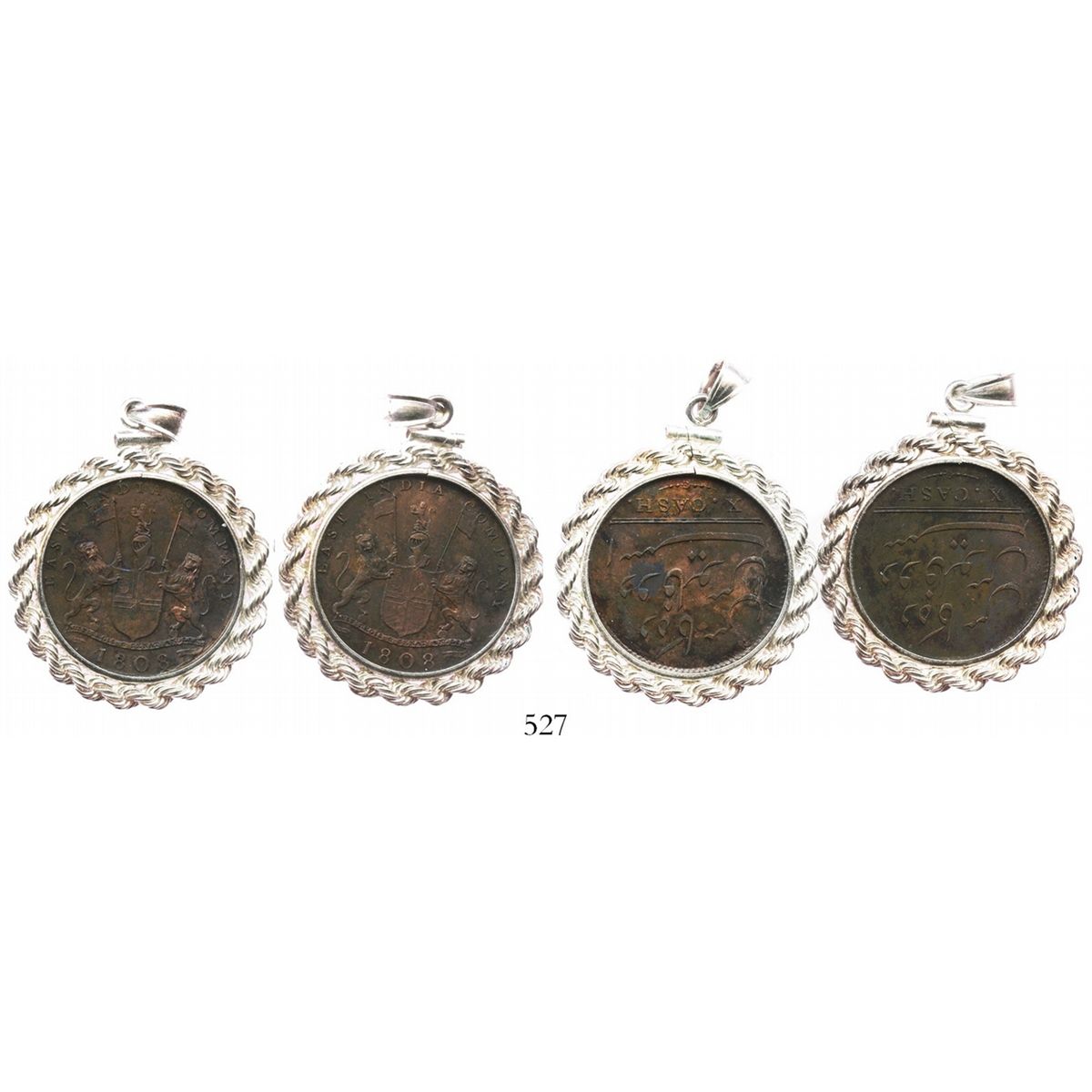 Lot of 2 British East India Co. copper X cash, 1808, mounted arms-side out in silver necklace bezels. KM-319. 17.8 grams total. Nice specimens, uncorroded but not completely cleaned, in standard-sized mountings. Recovered from: Admiral Gardner, sunk in 1809 southeast of England
