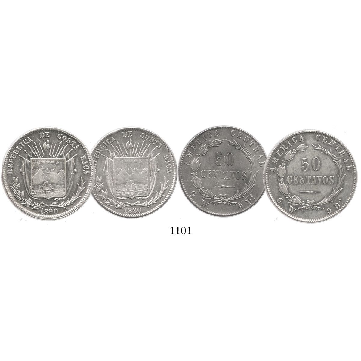 Lot of 2 Costa Rica 50 centavos (1880 and 1890). KM-124. 25.4 grams total. Lightly toned and subtly lustrous XF (both).