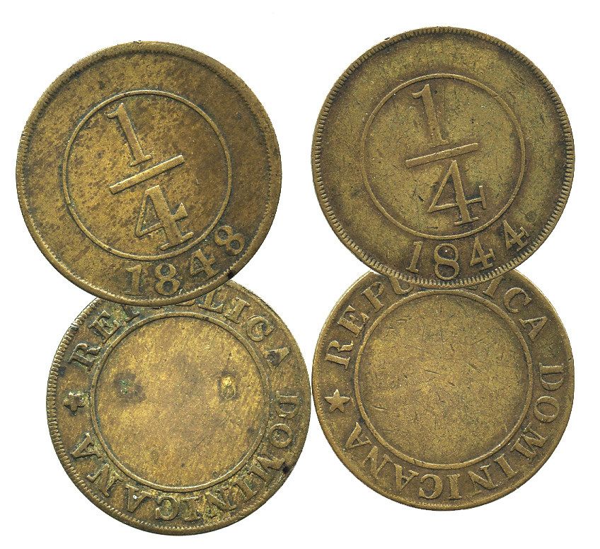 Lot of 2 Dominican Republic brass 1/4R, 1844 and 1848. KM-1 and KM-4. 7.0 grams total. Decent VF, dull brass color with toning around details.