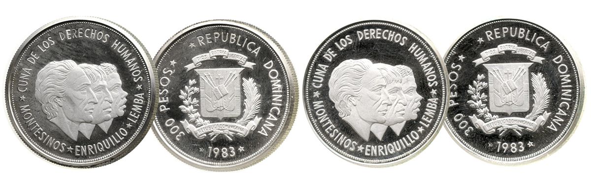 Lot of 2 Dominican Republic silver proof patterns of gold 300 pesos, 1983, Montesinos/Enriquillo/Lemba, one piedfort, rare. 30mm each; 30.0 and 15.1 grams. Lustrous proof with frosty details, rare pair in that only 25 were minted in silver and 5 in silver piedfort, with design of 3 busts of human rights leaders on obverse, arms on reverse.
