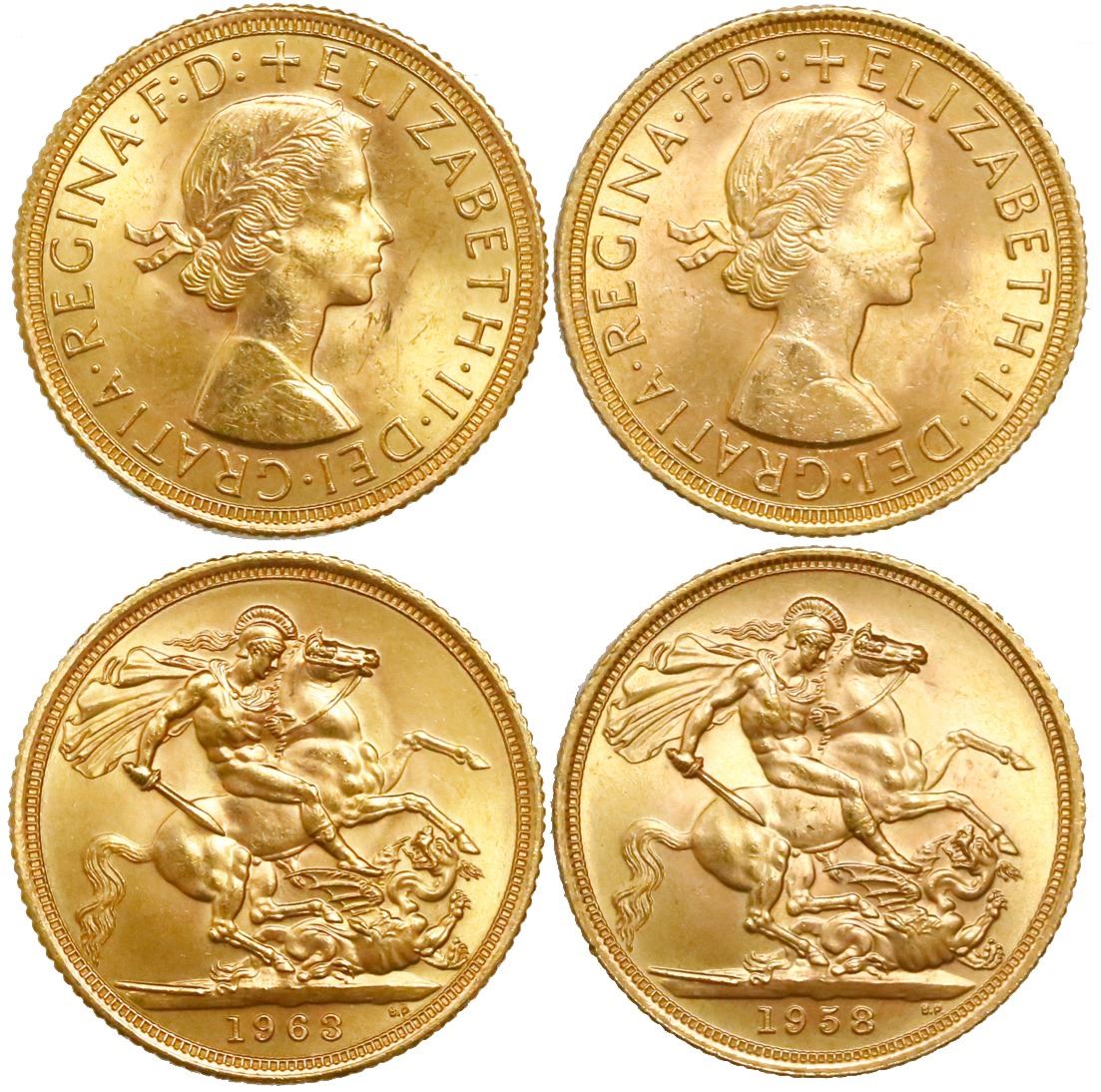 Lot of 2 Great Britain (London, England) sovereigns, Elizabeth II, 1958 and 1963.