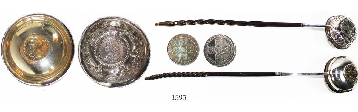 Lot of 2 Great Britain shillings (Anne 1709 and George II 1758) mounted inside the bowls of 2 silver tastevins (wine-testers) with whale-baleen handles. Each 14" long, the bowls about 2-1/4" in diameter and depths of 7/8" and 1-1/4". The coin details are F-VF but of course they are both heavily polished to match the silver bowls (one ornate, the other plain but with script initials JHC on outside), the dark-brown handles twisted and tipped with silver caps, intact and interesting.