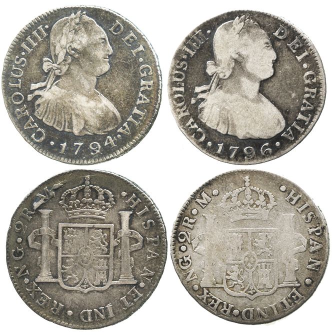 Lot of 2 Guatemala bust 2 reales of Charles IV: 1794M and 1796M. KM-51. 13.0 grams total. Both richly old-toned, the 1794 VF+ with luster and the 1796 Fine with weak centers, no problems.