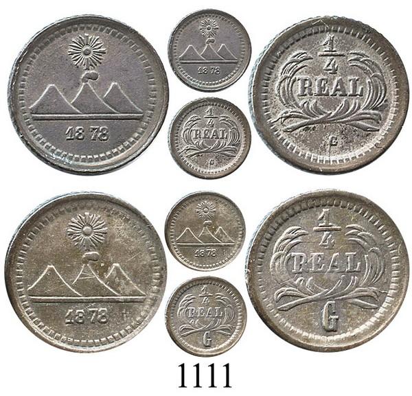 Lot of 2 Guatemala ¼ reales, 1878 small G and 1878 large G. KM-146a.3. 0.8 gram each. Richly rainbow-toned AU and UNC.