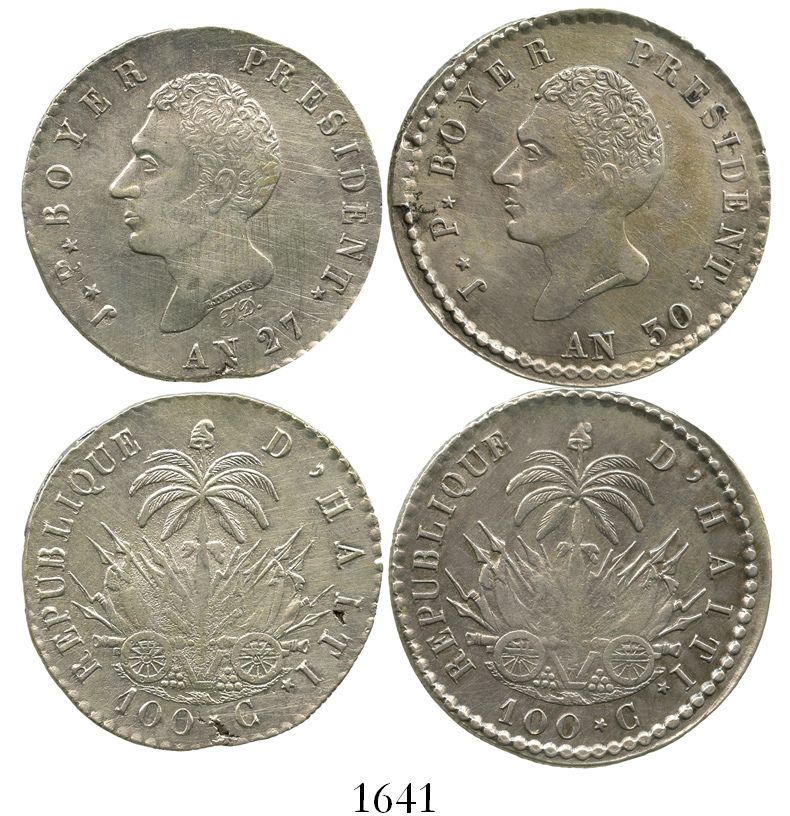 Lot of 2 Haiti 100 centimes, AN 27 and AN 30 (1830 and 1833). KM-A23. 20.5 grams total. Choice but cleaned XF, the AN 27 with crude edge and somewhat grainy reverse, the AN 30 with broad flan and somewhat weak reverse.