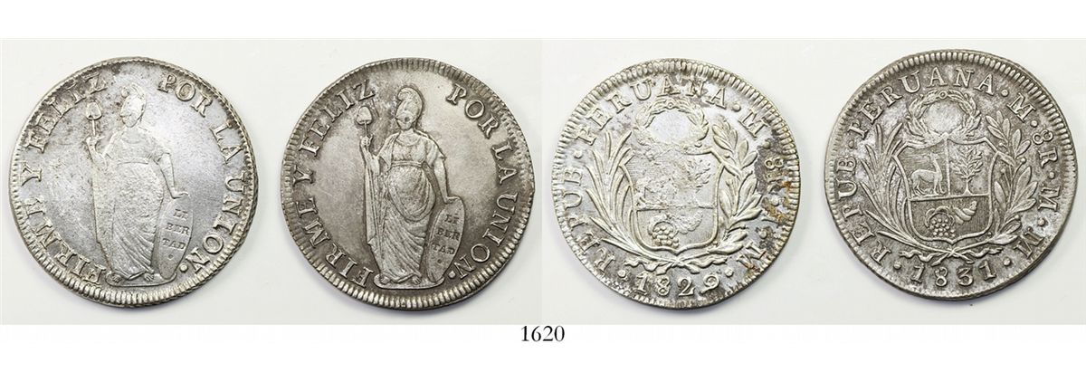 Lot of 2 Lima, Peru, 8 reales, 1829JM and 1831MM. KM-142.3 54.50 grams total. Both lustrous UNC with slightly weak centers, the 1831 more toned.