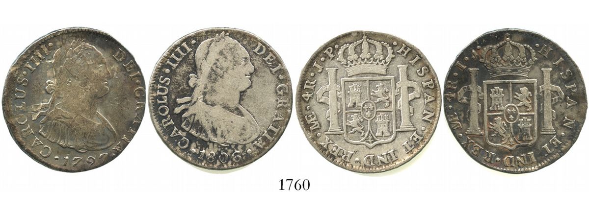 Lot of 2 Lima, Peru, bust 4 reales of Charles IV: 1797IJ and 1806JP. KM-98. 26.3 grams total. Fine or better, the 1797 with attractive blue toning but scraped on king's name.
