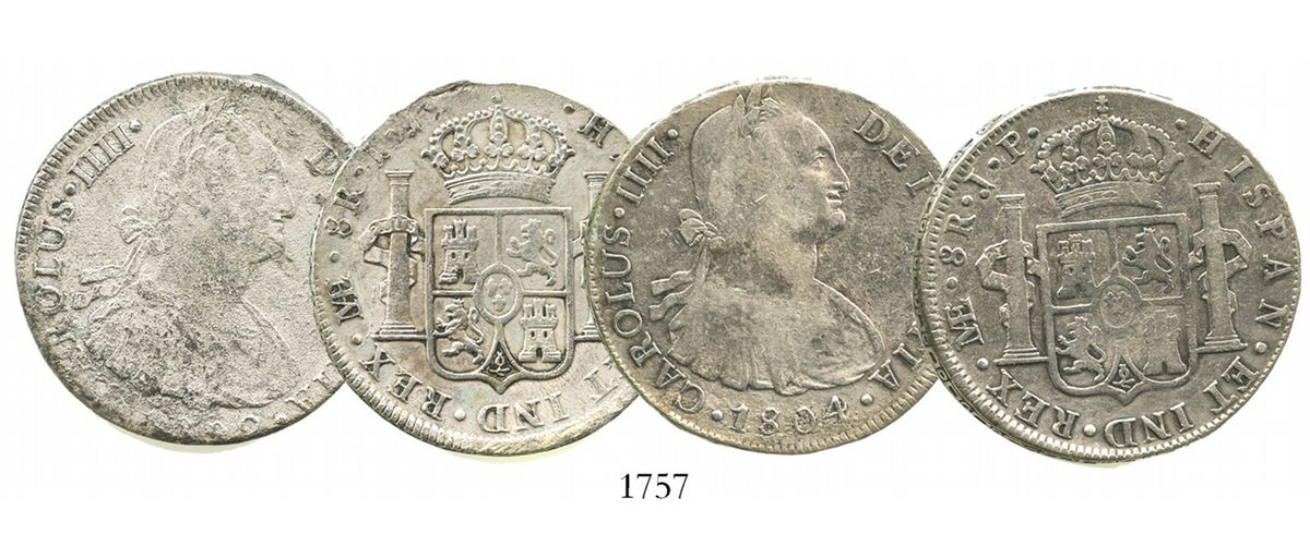 Lot of 2 Lima, Peru, bust 8 reales of Charles IV: 1802IJ and 1804JP. KM-97. 53.2 grams total. AVF overall, the 1802 with corroded obverse and off-center reverse, neither one toned.