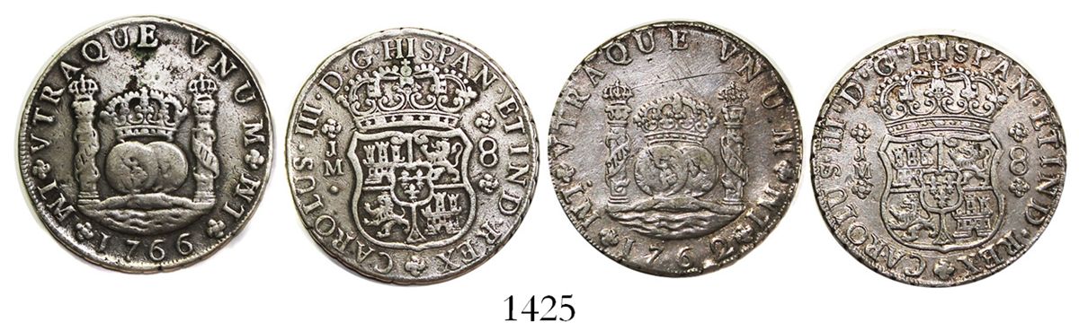 Lot of 2 Lima, Peru, pillar 8 reales, Charles III: 1762JM and 1766JM.