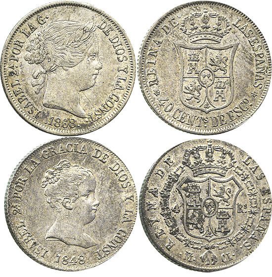 Lot of 2 Madrid, Spain, 2R-sized minors of Isabel II: 4R 1848CL and 40c 1868. 10.3 grams total. AU-UNC with traces of luster and light toning all over, nicely matched pair of different denominations but identical size.