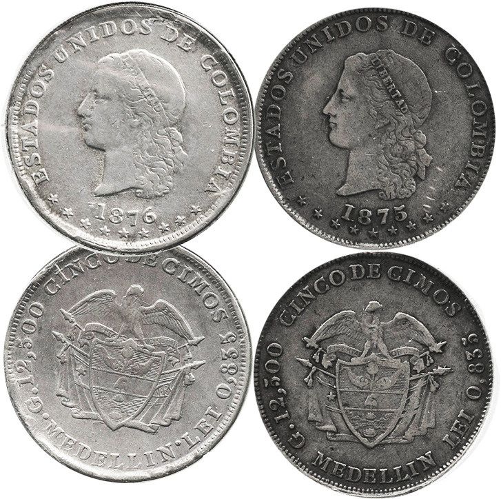 Lot of 2 Medellin, Colombia, 5 decimos: 1875 (upside-down B in O of ESTADOS) and 1876. KM-153.5. 24.9 grams total. The 1875 is bold VF with nice toning; the 1876 is lustrous AXF with slightly crude rims.