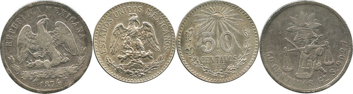 Lot of 2 Mexican 50 centavos of two different types: Guanajuato 1874S and Mexico City 1935. 21.4 grams total. The 1874 is VF with rim-nicks, faint toning; the 1935 is problem-free Mint State.