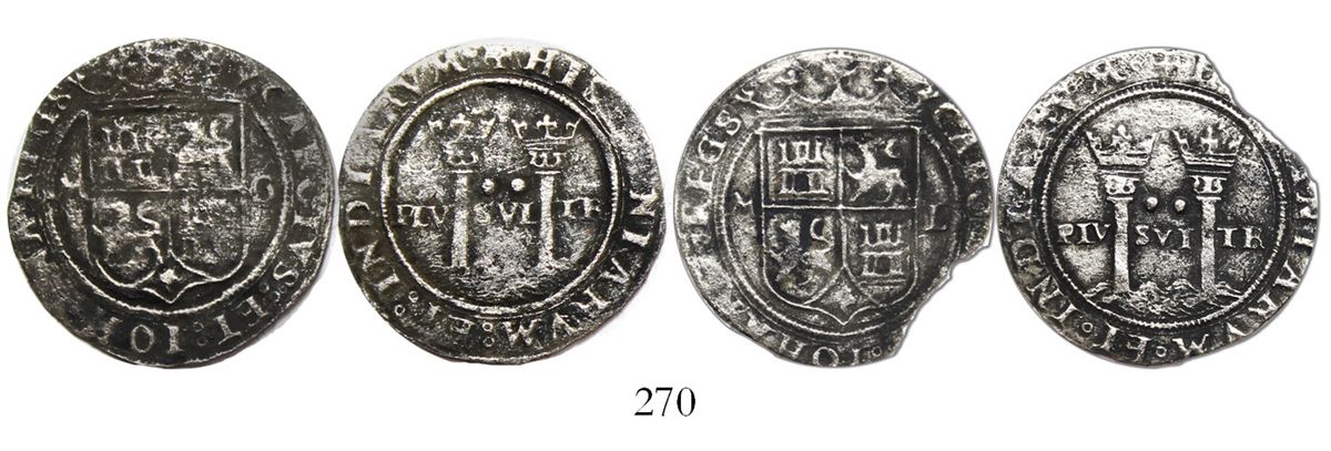 Lot of 2 Mexico City, Mexico, 2 reales, Charles-Joanna, "Late Series," assayers G and L to right, mintmark M to left. Nesmith 49 and 85. 8.83 grams total. Nice detail (including legends) despite moderate surface corrosion, contrasting toning. Recovered from: Unidentified ca.-1554 wreck off Santo Domingo