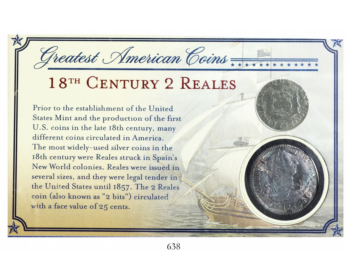 Lot of 2 Mexico City, Mexico, 2 reales in promotional packaging: Pillar, Ferdinand VI, 1751M, encapsulated ANACS El Cazador Select; and bust, Charles III, 1783FF, in Franklin Mint plastic holder (without wreck history). 6" x 4". Well-detailed coins with light corrosion only, the bust 2R nicely toned, housed in sturdy promotional plastic detailing the wreck and its legacy. Recovered from: Cazador, sunk in 1784 off New Orleans