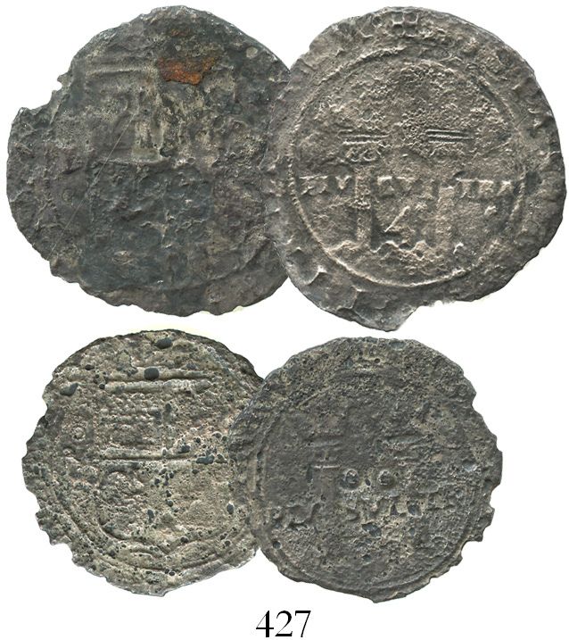 Lot of 2 Mexico City, Mexico, Charles-Joanna, "Late Series" coins: 4R assayer L to left, and 2R assayer O to right (both with mintmark M opposite). 9.2 grams total. Both heavily corroded and dark but with clear enough details to attribute. Recovered from: Unidentified ca.-1570 wreck off the northern coast of South America