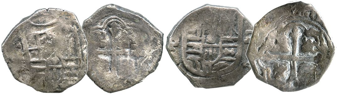 Lot of 2 Mexico City, Mexico, cob 2 reales, Philip IV, assayer P and not visible. KM-33. 13.5 grams total. Nearly full shields and crosses, both richly old-toned and no worse than Fine for wear, a nicely matched pair.