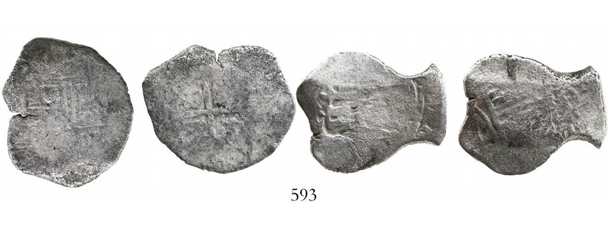 Lot of 2 Mexico City, Mexico, cob 4 reales, Charles II, assayers not visible. KM-39. 22.58 grams total. One interesting shape but both coins almost featureless due to poor strike and sea-wear. Recovered from: Joanna, sunk in 1682 off South Africa