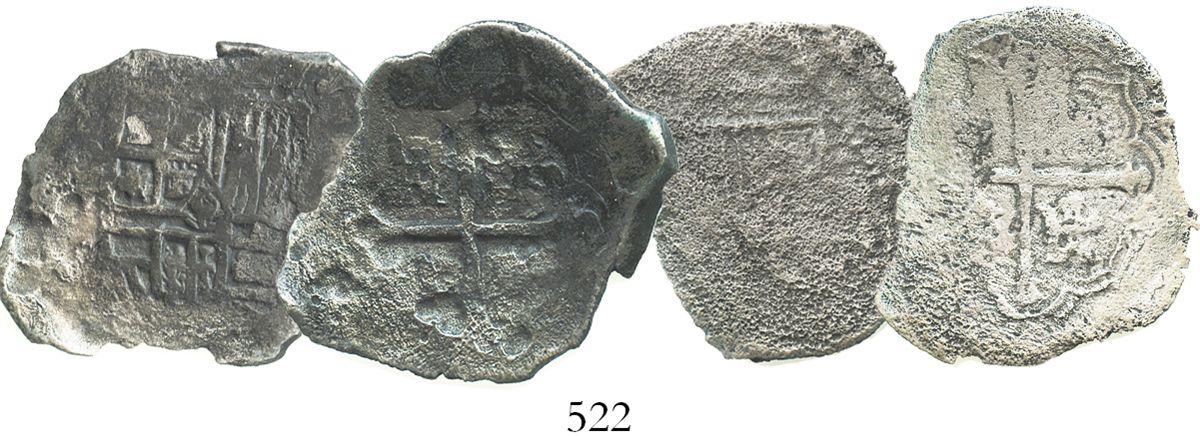 Lot of 2 Mexico City, Mexico, cob 4 reales, Philip III, Grades 3 and 4. KM-37.2. 16.6 grams total. Moderately to heavily corroded but with recognizable shields and crosses, one darkly toned. With Fisher photo-certificates #1579 and 4307. Recovered from: Santa Margarita, sunk in 1622 west of Key West, Florida