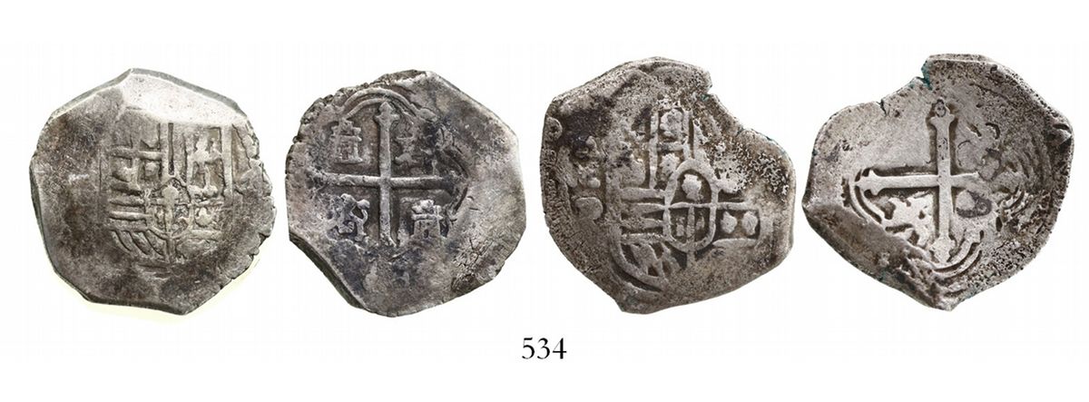 Lot of 2 Mexico City, Mexico, cob 4 reales, Philip IV, assayer P (visible on one).