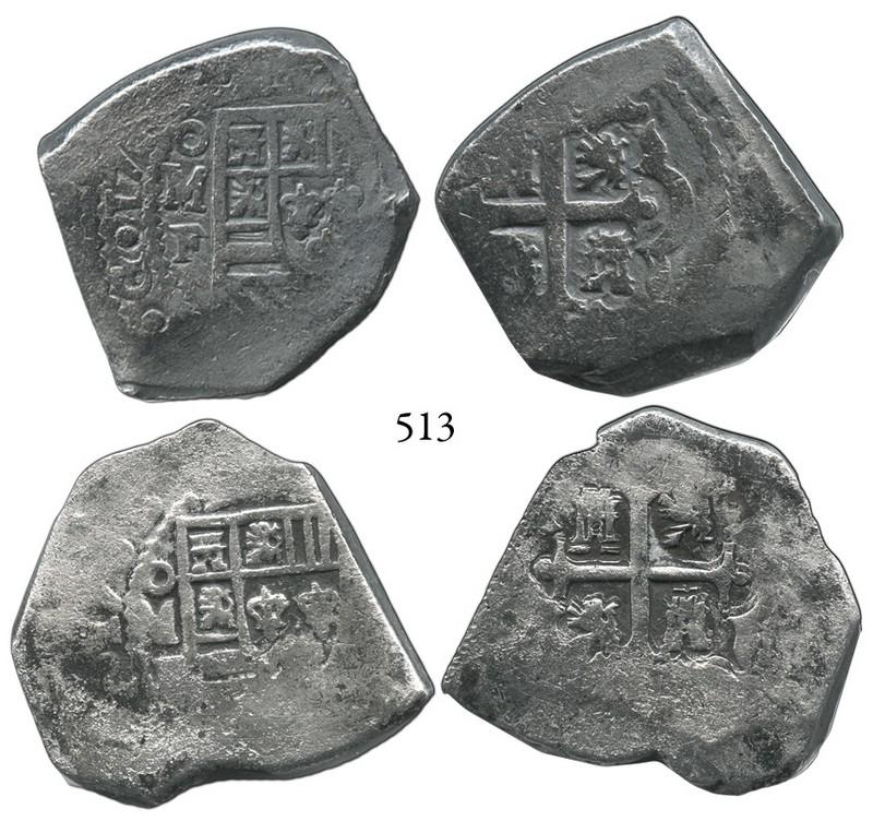 Lot of 2 Mexico City, Mexico, cob 8 reales, Philip V, assayer F (1730-32). S-M26, KM-47a. 26.5 and 26.4 grams. Two thick and solid coins with partial dates and good full crosses, one darkly toned but corrosion-free and with full oMF, the other very lightly corroded but nicely detailed. With certificates #AC3678 and AC13055. Recovered from: Rooswijk, sunk in 1739 off southeast England