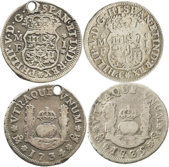 Lot of 2 Mexico City, Mexico, pillar 1R of Philip V: 1734MF and 1735MF. KM-75.1. 6.3 grams total. Both AVF, the 1734 holed but also attractively toned.
