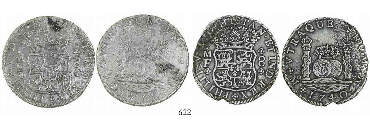 Lot of 2 Mexico City, Mexico, pillar 8 reales, Philip V, 1735MF and 1740MF. KM-103. 49.29 grams total. Bold AU details but with areas of heavy corrosion ((on the edge of the 1740, which is beautifully toned, and on the pillars of the 1735). Pedigreed to the Ponterio auction of February 1997, with original lot-tag #921, and with generic certificates from the salvagers. Recovered from: Reijgersdaal, sunk in 1747 off South Africa
