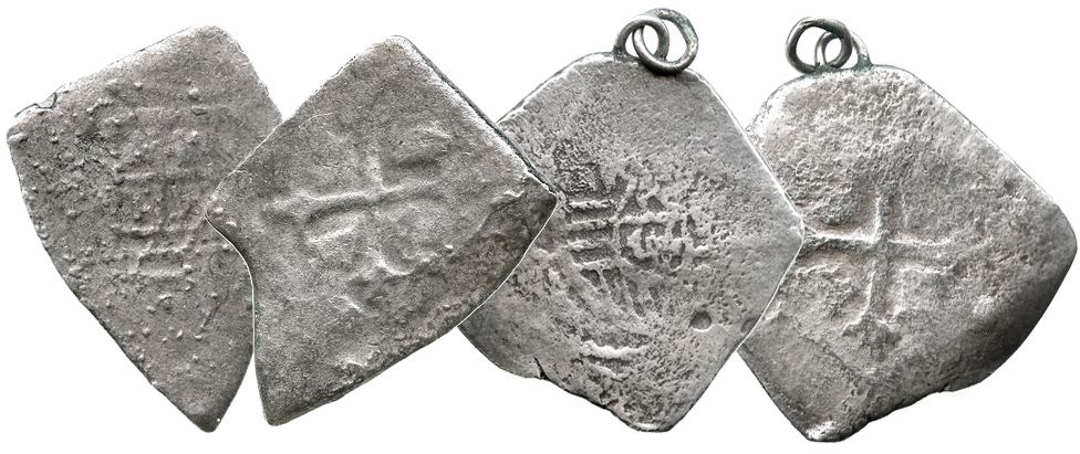 Lot of 2 Mexico City, Mexico, silver cobs of Charles II: one 4R with loop and jump-ring at top and one 2R. 16.0 grams total. Thin and corroded but with good crosses. Recovered from: Joanna, sunk in 1682 off South Africa