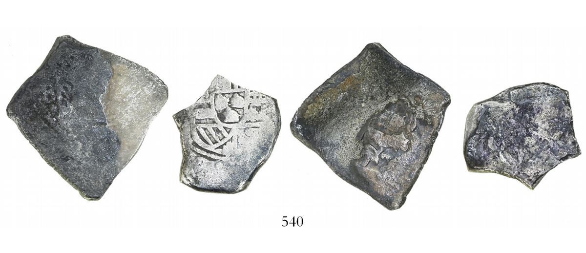 Lot of 2 Mexico City, Mexico, silver cobs (one 8R and one 4R) of Philip V, assayer not visible, partially encrusted. 38.29 grams total. The 8R is solid, with large patch of sandy encrustation, full denomination .8.; the 4R (odd shape) is corroded on the cross side but has a nice shield. Pedigreed to the collection of John Keshishian (Kip Wagner's doctor), with original Real Eight Co. certificates. Recovered from: Spanish 1715 Fleet, east coast of Florida