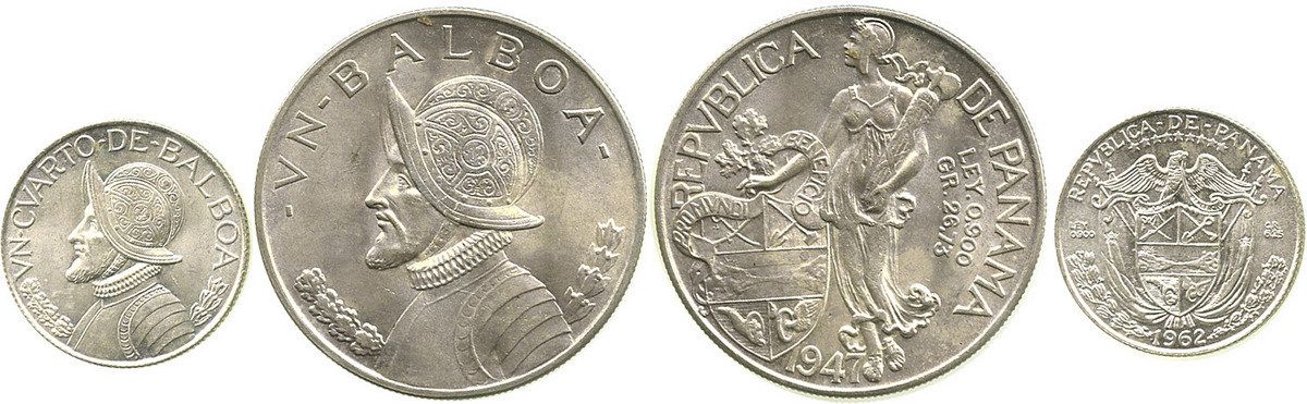 Lot of 2 Panama silver coins: 1 balboa, 1947; and 1/4 balboa, 1962. 33.0 grams total. Both Mint State, the 1/4 balboa quite lustrous, no problems.